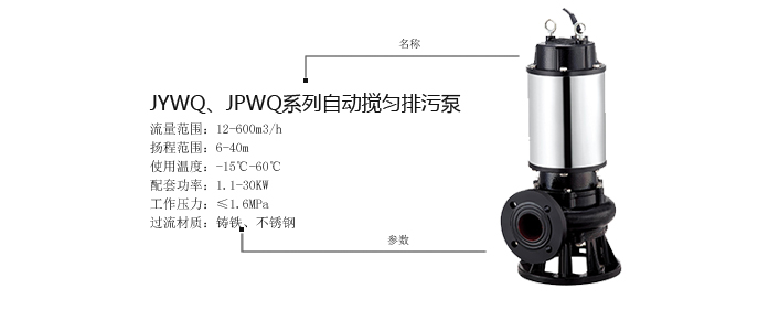 JYWQ、JPWQ係列自動攪勻排汙泵產品電子樣本所涵蓋的參數表、性能表、尺寸表、圖片、文字描述及產品結構等信息,僅為排汙泵生產廠家上海豐企JYWQ、JPWQ係列自動攪勻排汙泵說明書的一部分,供選型參考之用,詳細水泵產品使用說明書、CAD圖紙、安裝尺寸圖、水泵重量及詳細的工作原理、價格等請來電谘詢。